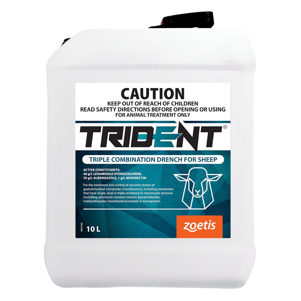 Trident Triple Combination Drench for Sheep controls sensitive and resistant strains of gastrointestinal nematodes in sheep using three actives from separate chemical families: 40 g/L Levamisole Hydrochloride (imidazothiazole), 25 g/L Albendazole (benzimidazole), and 1 g/L Moxidectin (macrocyclic lactone). This combination targets worms with single, dual, or triple resistance to macrocyclic lactones (including abamectin-resistant strains), benzimidazoles, imidazothiazoles (levamisole/morantel), and monepantel. Zoetis Australia developed Trident specifically to address the growing challenge of drench resistance in Australian sheep operations.